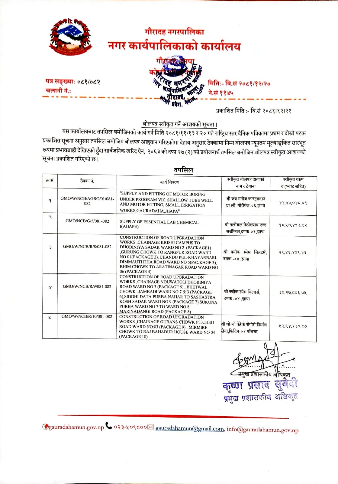 बोलपत्र स्विकृत गर्ने आशयको सूचना