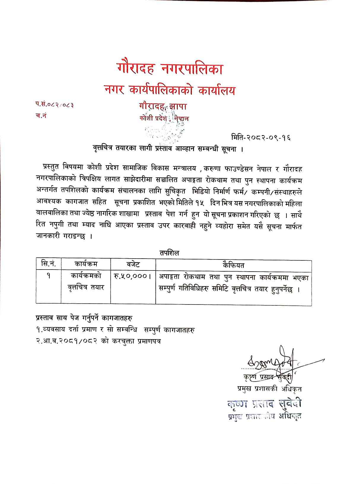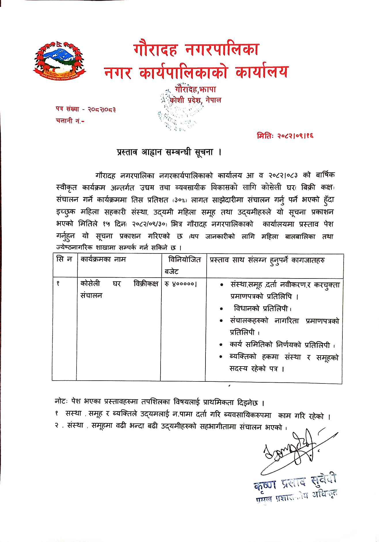 प्रस्ताव आह्वान सम्बन्धी सूचना ।