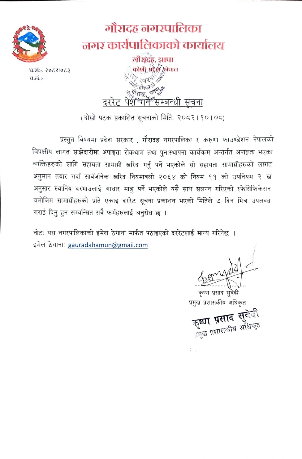 सहायता सामाग्रीको दररेट पेश गर्ने सूचना