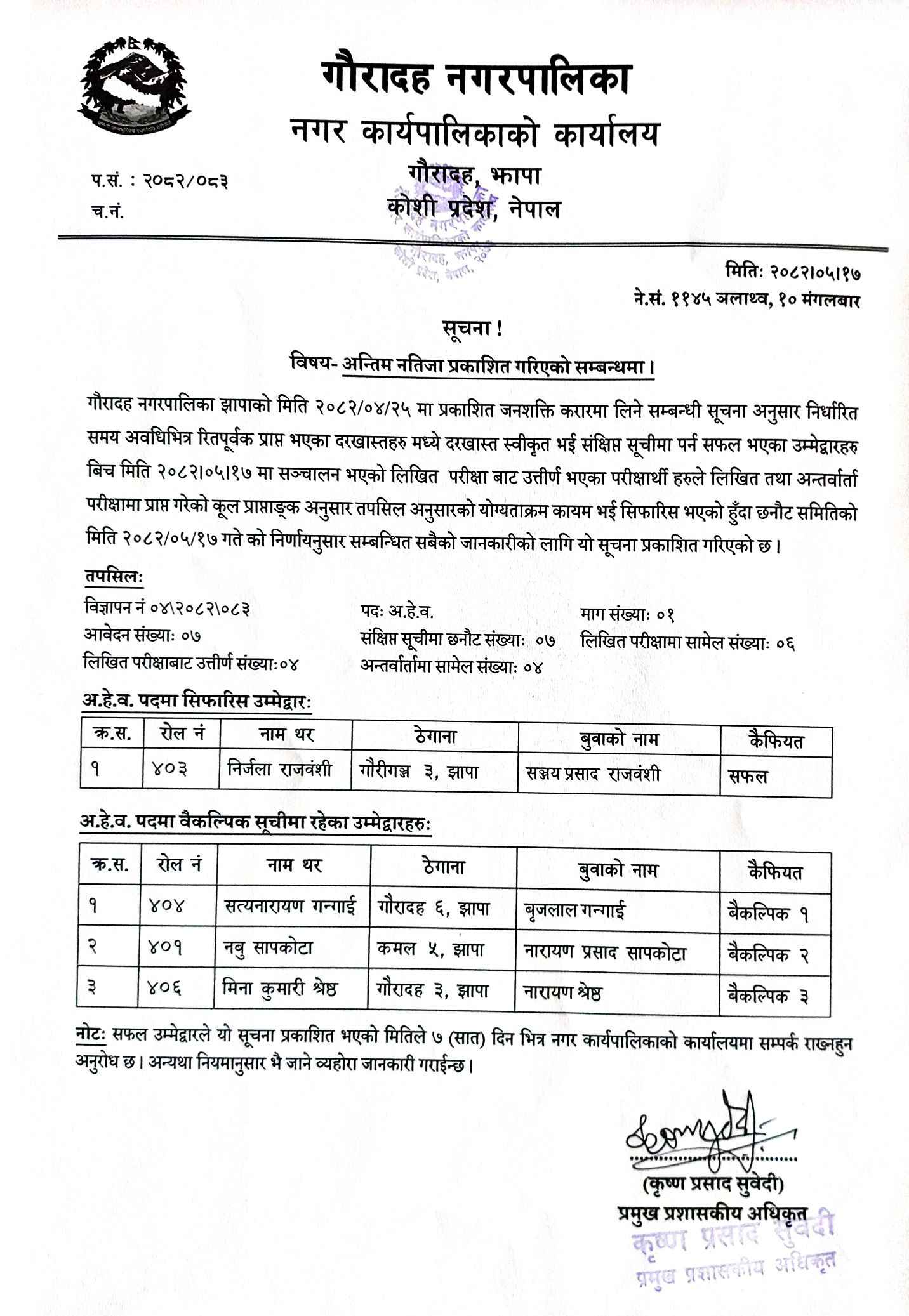 अ.हे.व. पदको अन्तिम नतिजा प्रकाशित गरिएको सूचना ।