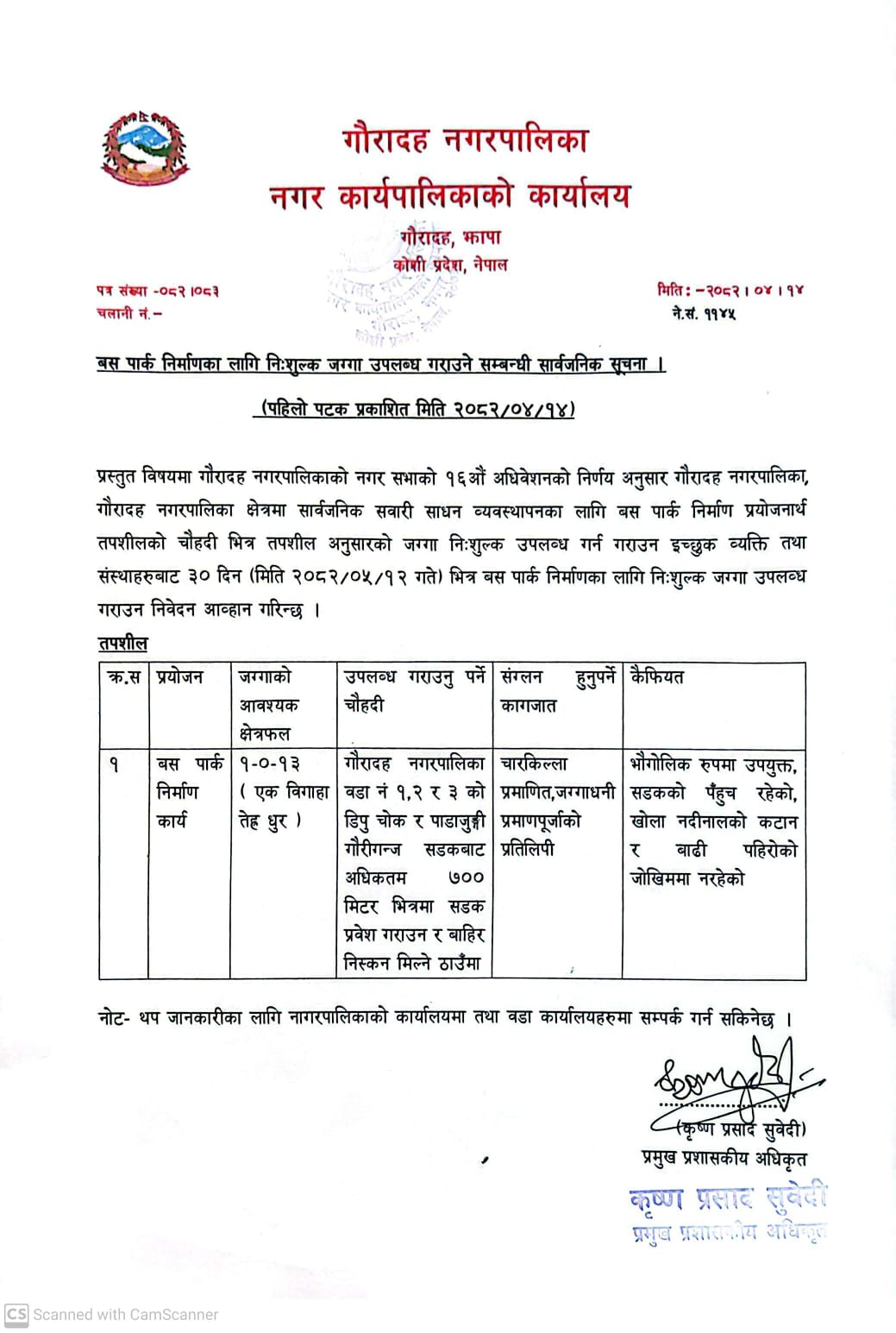 बसपार्क निर्माणका लागि निःशुल्क जग्गा उपलब्ध गराउने सम्बन्धी सार्वजनीक सूचना ।