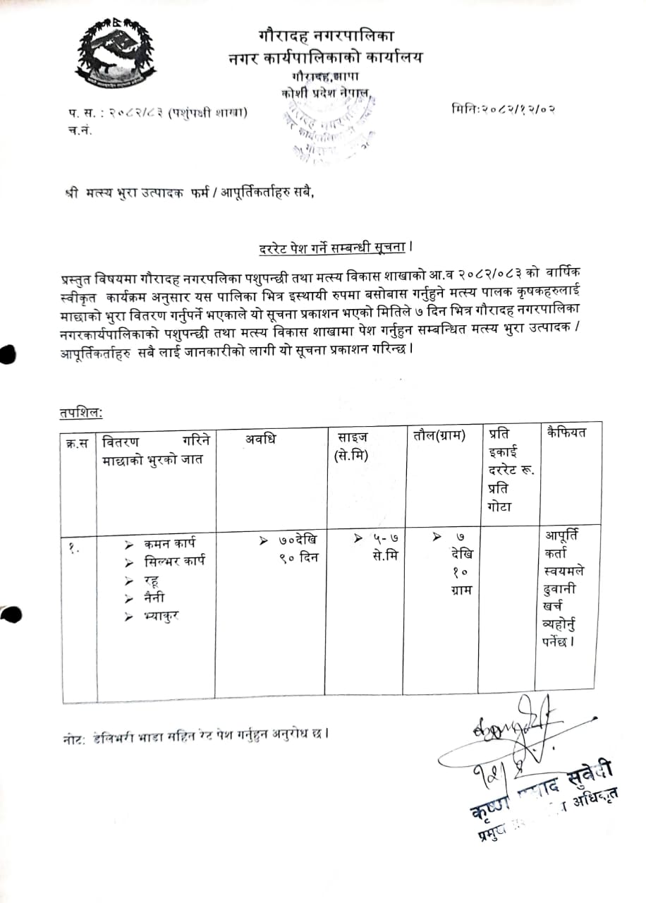 विभीन्न जातका माछाको भुराको दररेट पेश गर्ने सम्बन्धमा